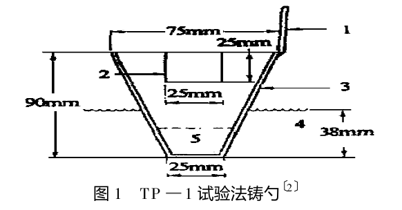 能保溫(718±5) ℃的 11kg 鋁的石墨坩堝電阻爐;標準合格的熱電偶;兩個錐形鑄勺或鑄模(圖1),內(nèi)側(cè)涂云母薄層外側(cè)噴石墨;鑄勺預熱(至316℃) 爐;計時器;石墨攪拌棒;簡易夾鉗;水冷卻槽(圖2) ;工作服和面罩等。